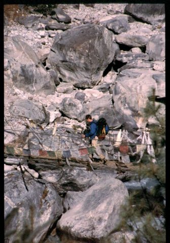 Crossing a rope bridge